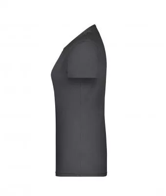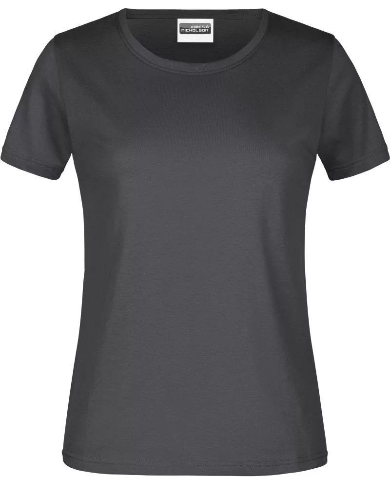 A szürke rövid ujjú női póló anyaga 100% pamutból (single jersey) készült, 150 g/m2 súlyú.