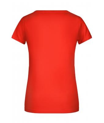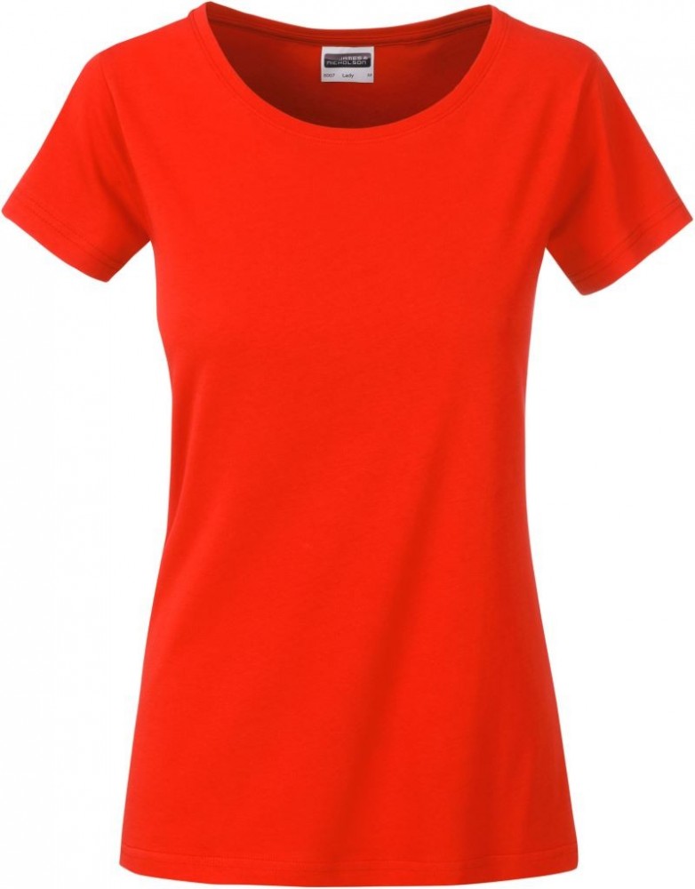 A piros rövid ujjú női póló anyaga 100% pamutból (organikus, single jersey) készült, 120 g/m2 súlyú.