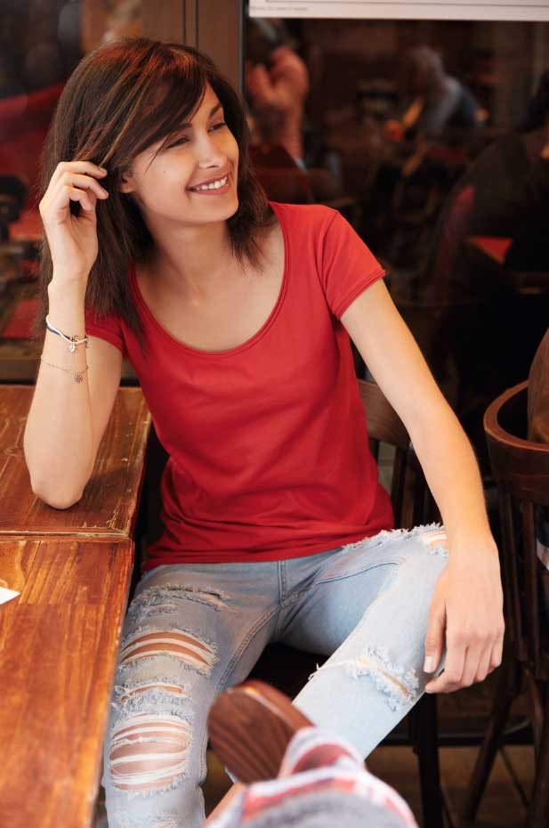 Enyhén karcsúsított szabású, kiváló minőségű piros rövid ujjú női póló