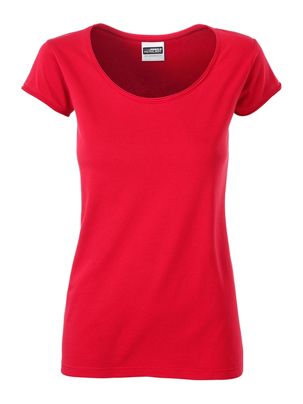 A piros rövid ujjú női póló anyaga 100% pamutból (organikus) készült, 120 g/m2 súlyú.