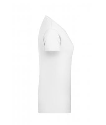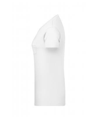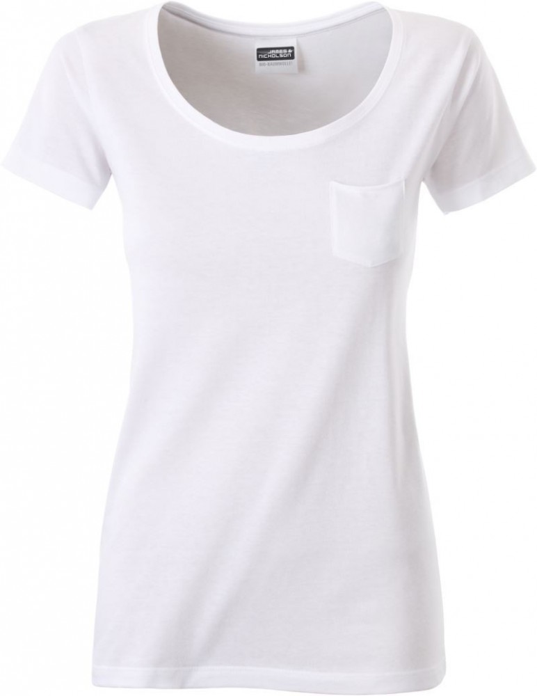 Enyhén karcsúsított szabású, kiváló minőségű fehér rövid ujjú női póló mellzsebbel.