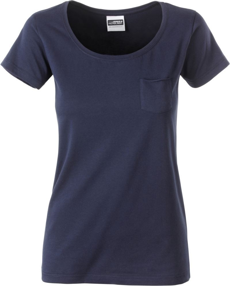 Kiváló minőségű termékünk ez az enyhén karcsúsított szabású kék rövid ujjú női póló mellzsebbel.