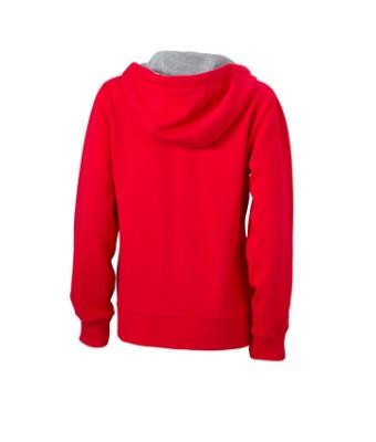 Kiváló minőségű termékünk ez az enyhén karcsúsított szabású piros női pulóver kétrétegű kapucnival és kenguru zsebbel, kontrasztos színösszeállításban.