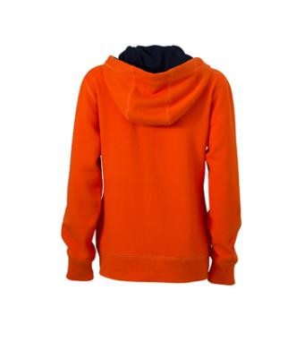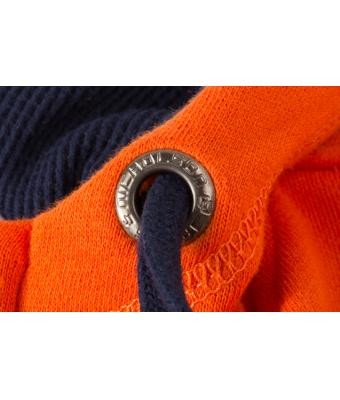 Enyhén karcsúsított szabású, kiváló minőségű narancs női pulóver kétrétegű kapucnival és kenguru zsebbel, kontrasztos színösszeállításban.