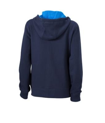 Kiváló minőségű termékünk ez az enyhén karcsúsított szabású kék női pulóver kétrétegű kapucnival és kenguru zsebbel, kontrasztos színösszeállításban.