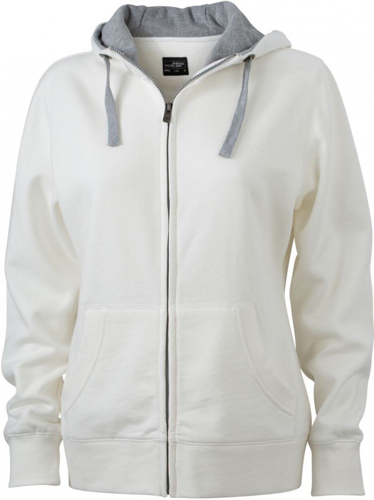 Enyhén karcsúsított szabású, kiváló minőségű törtfehér női pulóver kétrétegű kapucnival és kenguru zsebbel, kontrasztos színösszeállításban.