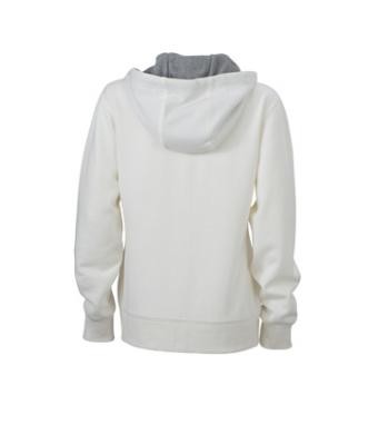 Enyhén karcsúsított szabású, kiváló minőségű törtfehér női pulóver kétrétegű kapucnival és kenguru zsebbel, kontrasztos színösszeállításban