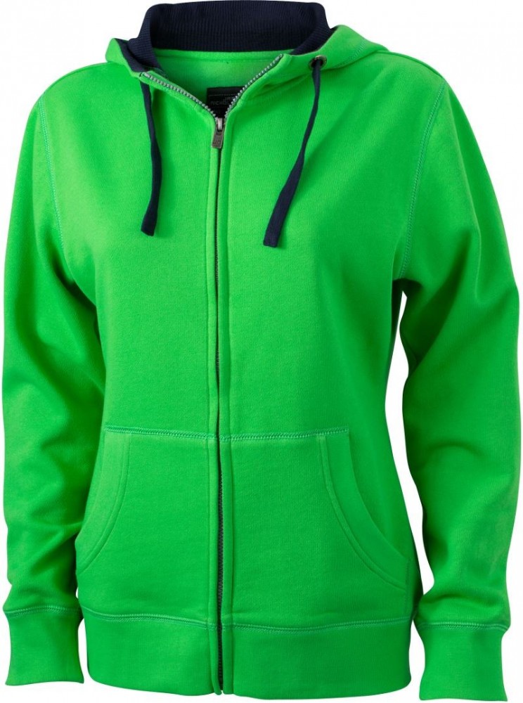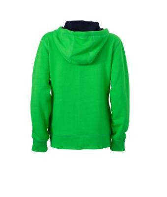 Enyhén karcsúsított szabású, kiváló minőségű zöld női pulóver kétrétegű kapucnival és kenguru zsebbel, kontrasztos színösszeállításban.