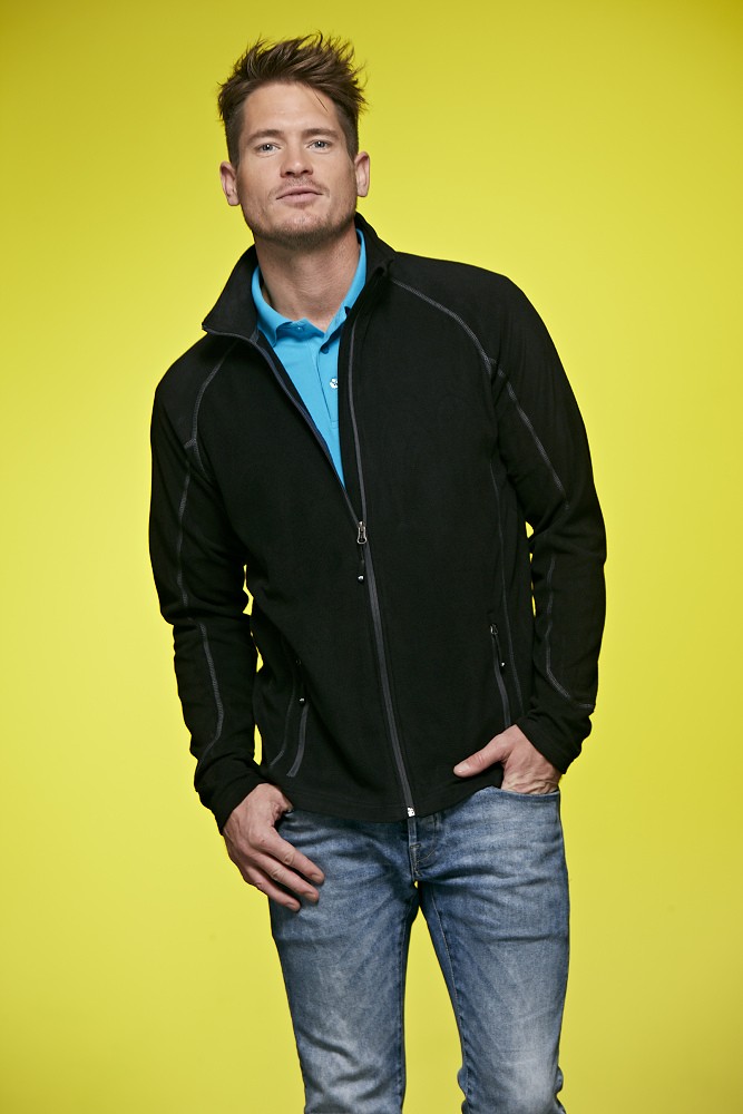 Klasszikus szabású, kiváló minőségű fekete polár pulóver cipzáras oldalzsebekkel és állógallérral