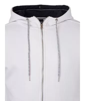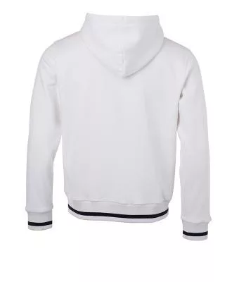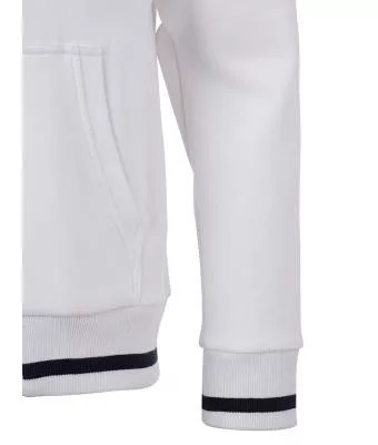 Klasszikus szabású, kiváló minőségű fehér pulóver kétrétegű kapucnival és kenguru zsebbel, kontrasztos színösszeállításban.