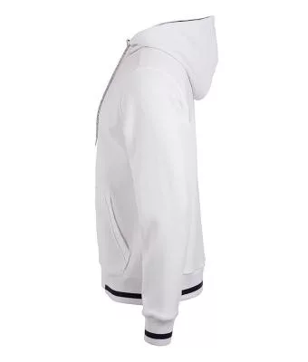 Kiváló minőségű termékünk ez a klasszikus szabású fehér pulóver kétrétegű kapucnival és kenguru zsebbel, kontrasztos színösszeállításban.