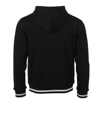 Klasszikus szabású, kiváló minőségű fekete pulóver kétrétegű kapucnival és kenguru zsebbel, kontrasztos színösszeállításban.