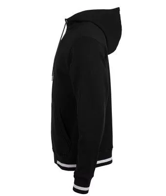 Klasszikus szabású, kiváló minőségű fekete pulóver kétrétegű kapucnival és kenguru zsebbel, kontrasztos színösszeállításban