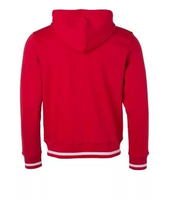 Kiváló minőségű termékünk ez a klasszikus szabású piros pulóver kétrétegű kapucnival és kenguru zsebbel, kontrasztos színösszeállításban.