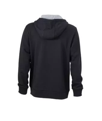 Klasszikus szabású, kiváló minőségű fekete pulóver kétrétegű kapucnival és kenguru zsebbel, kontrasztos színösszeállításban