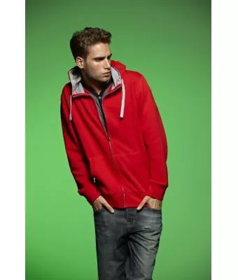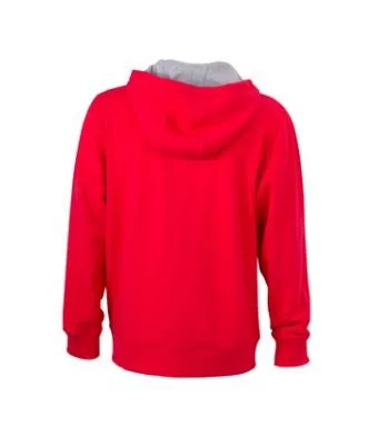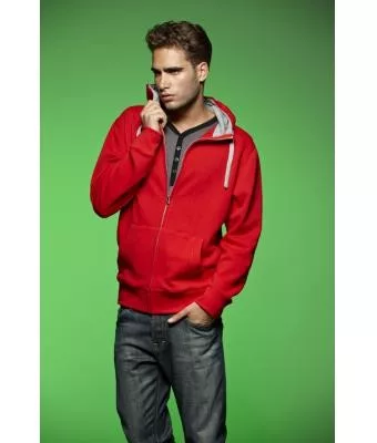 Kiváló minőségű termékünk ez a klasszikus szabású piros pulóver kétrétegű kapucnival és kenguru zsebbel, kontrasztos színösszeállításban.