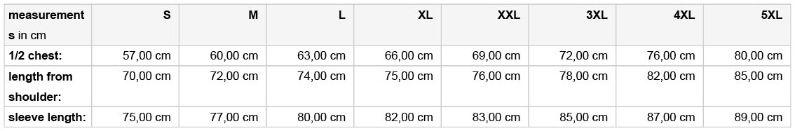 A termék az alábbi méretekben kapható: S, M, L, XL, XXL, 3XL, 4XL, 5XL