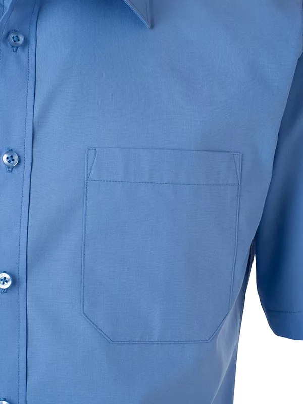Enyhén karcsúsított szabású, kiváló minőségű kék rövid ujjú ing mellzsebbel.