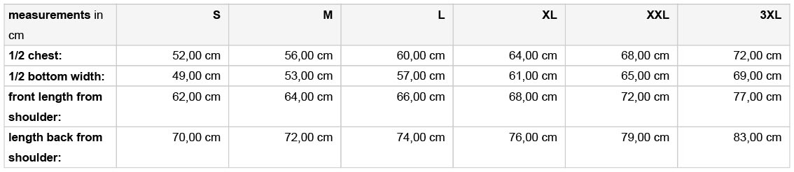 A termék az alábbi méretekben kapható: S, M, L, XL, XXL, 3XL