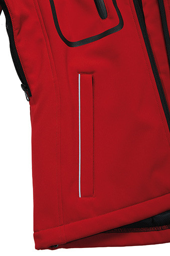 Klasszikus szabású, kiváló minőségű szél- és vízálló, légáteresztő és gőzáteresztő piros softshell dzseki levehető, bélelt kapucnival.