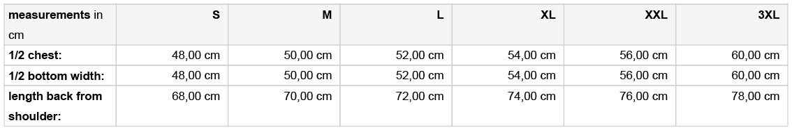 A termék az alábbi méretekben kapható: S, M, L, XL, XXL, 3XL