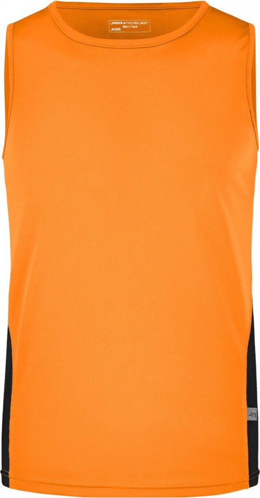 Kiváló minőségű termékünk ez a klasszikus szabású nedvességelvezető és gyorsan száradó narancs ujjatlan póló, kontrasztos színű betéttel és fényvisszaverő nyomással a hátán