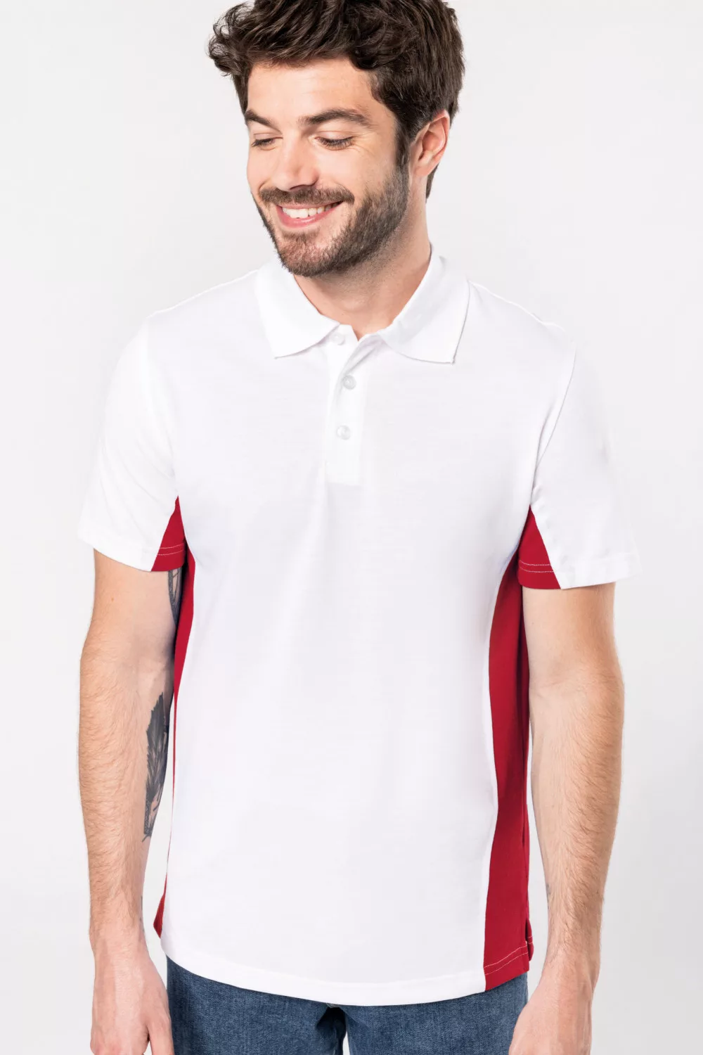 Kiváló minőségű, kontrasztos színű raglán ujjú fehér galléros póló.