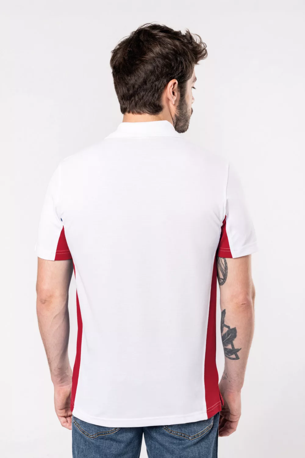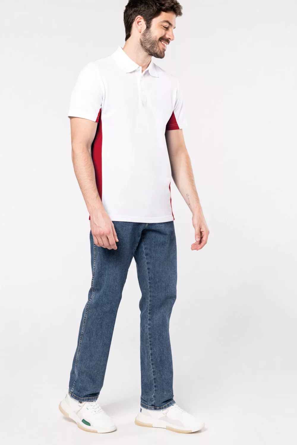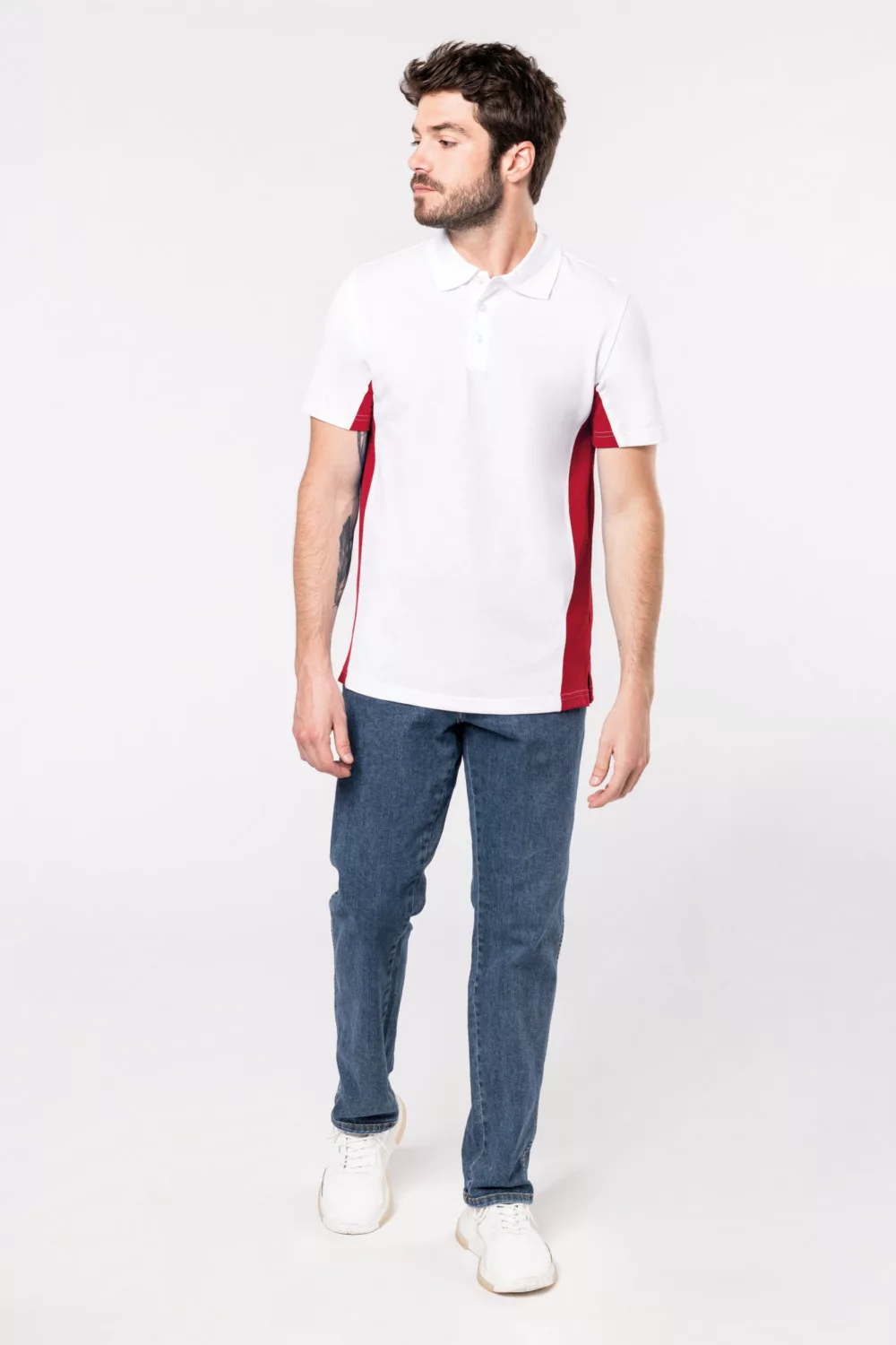 Kiváló minőségű varrási eljárás, minden öltés megkétszerezett. A fehér galléros póló három gombbal záródik. A póló lapos, kötött gallérral és oldalsó szellőzőnyílásokkal készült.