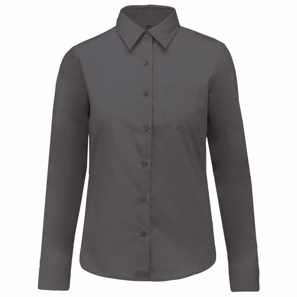 Kiváló minőségű termékünk ez az enyhén karcsúsított szabású, szürke hosszú ujjú női blúz bal oldalon mellzsebbel.