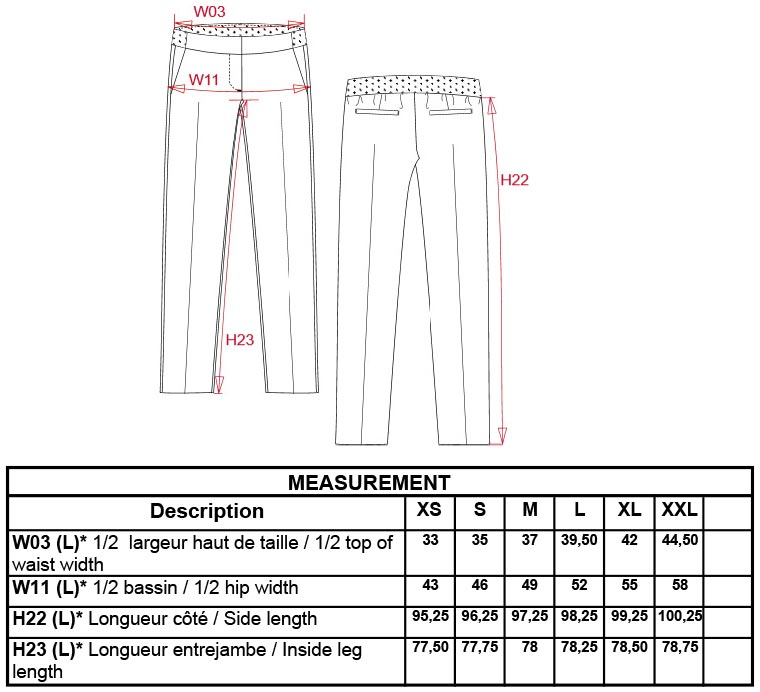 A kék nadrág 2 elülső svédzsebbel, 2 hátsó díszített zsebbel készült. Rugalmas övrésszel készült, az oldalakon övhurokkal. Cipzáras, rejtett horoggal készült a gombra. A belső lábszár 78 cm. A lábak szegetlenek, így megfelelő méretre alakítható.