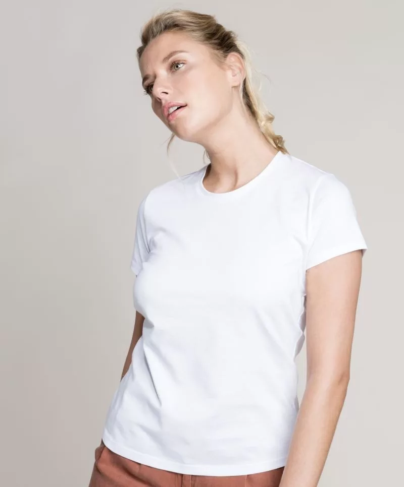 Kiváló minőségű, karcsúsított szabású rövid ujjú fehér női póló.