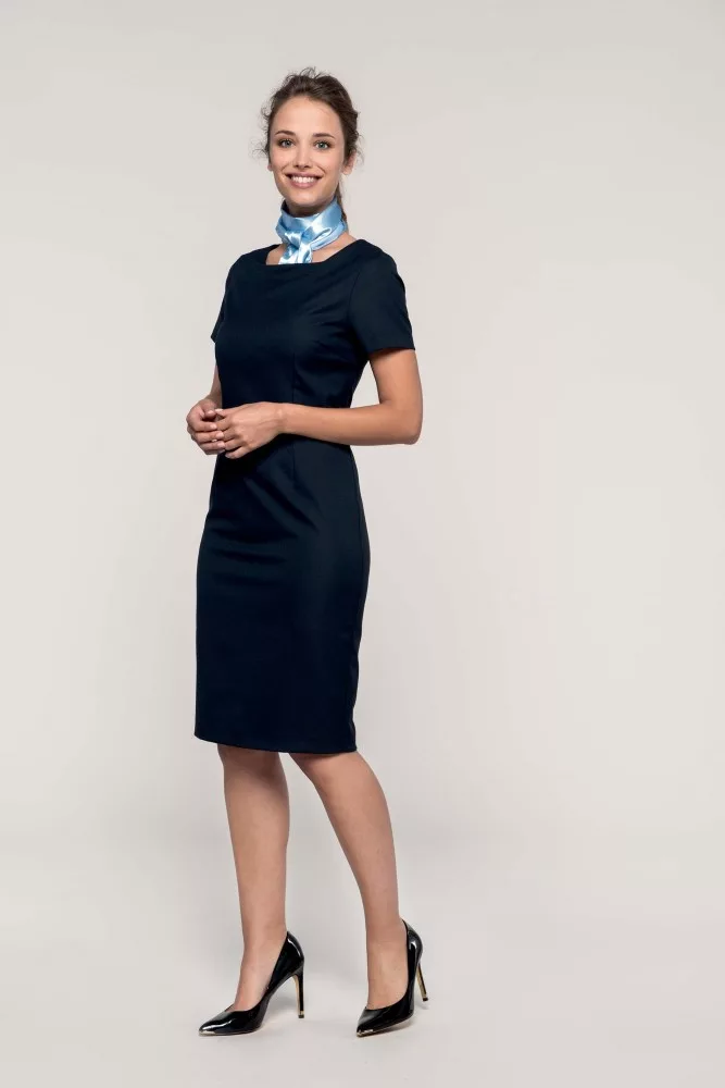 A kék női ruha anyaga 64% poliészterből, 34% viszkózból és 2% elasztánból készült, 220 g/m2 súlyú. A kényelem érdekében stretch béléssel készült.