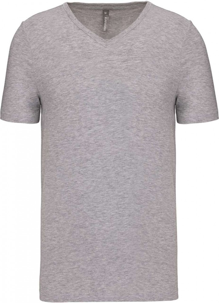 A szürke póló keskeny V-nyakkivágással készült. A váll és nyakrész szalagos megerősítést kapott, hogy a póló tartósabb és ellenállóbb legyen.