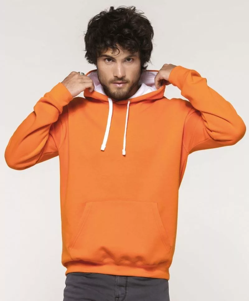 Klasszikus szabású, kapucnis, kenguru zsebes, kiváló minőségű, narancssárga pulóver.