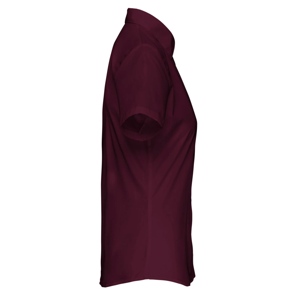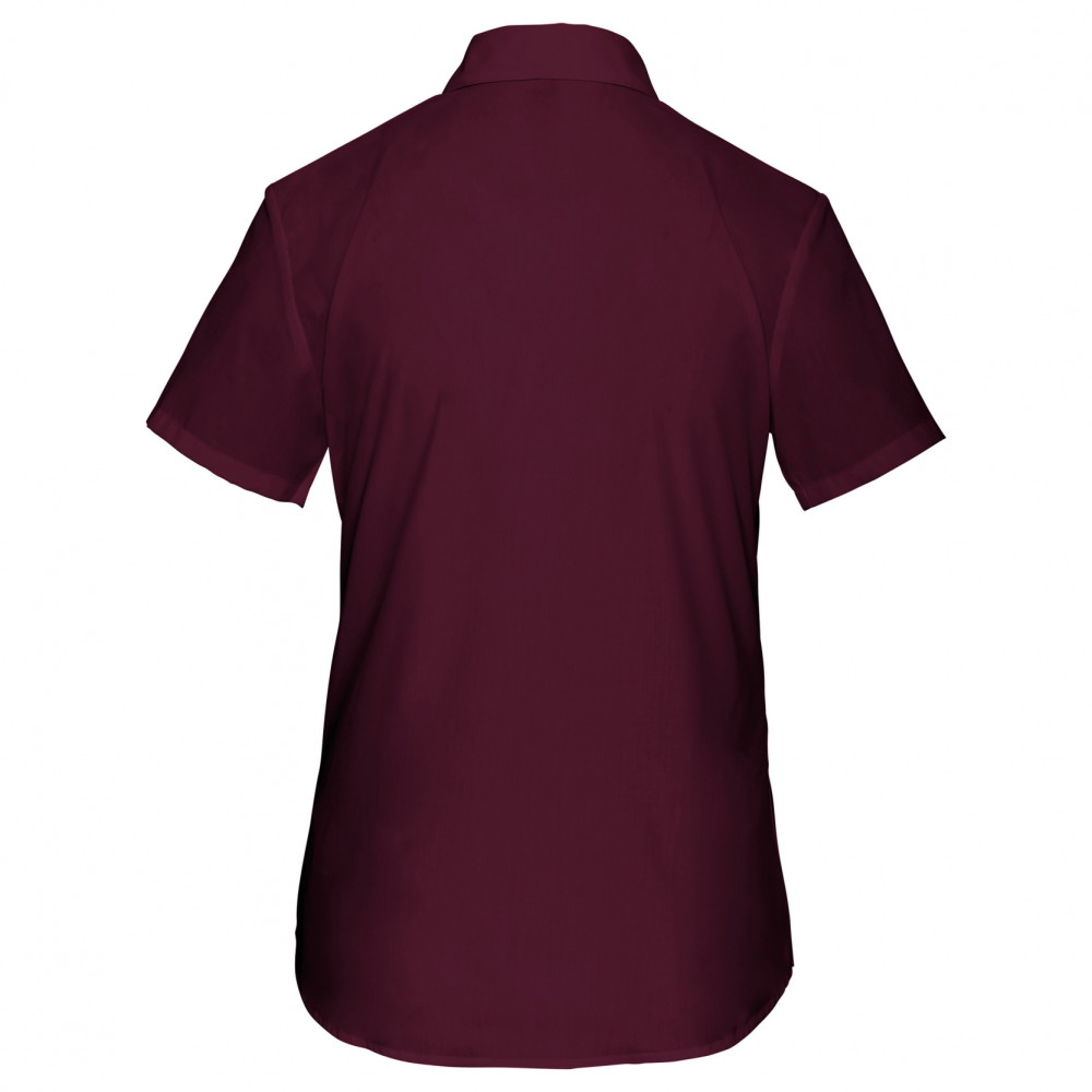 Kiváló minőségű termékünk ez az enyhén karcsúsított szabású, bordó rövid ujjú női blúz bal oldalon mellzsebbel.