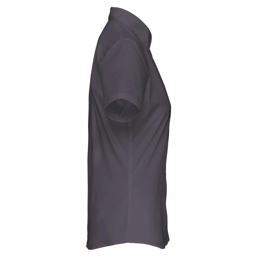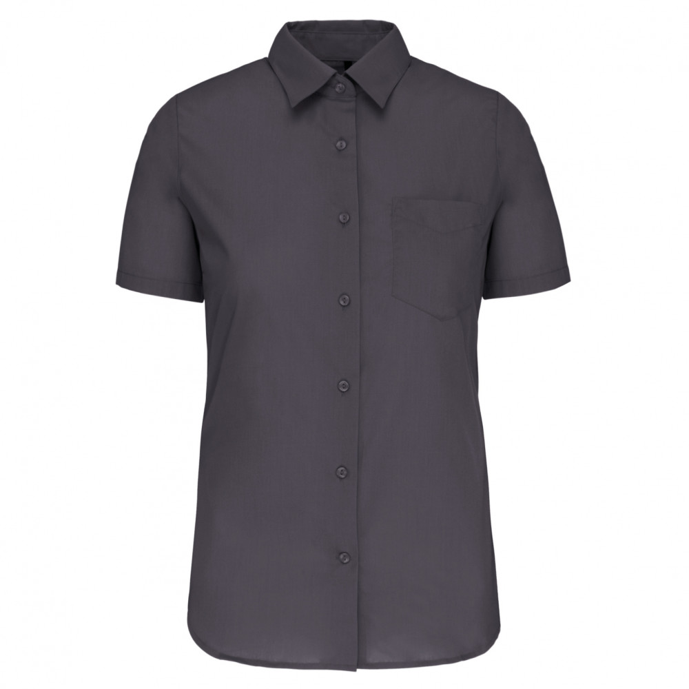 Enyhén karcsúsított szabású, kiváló minőségű szürke rövid ujjú női blúz bal oldalon mellzsebbel.