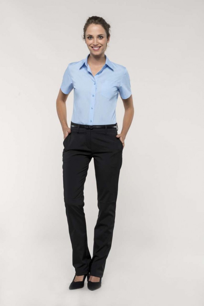 Enyhén karcsúsított szabású, kiváló minőségű kék rövid ujjú női blúz bal oldalon mellzsebbel.