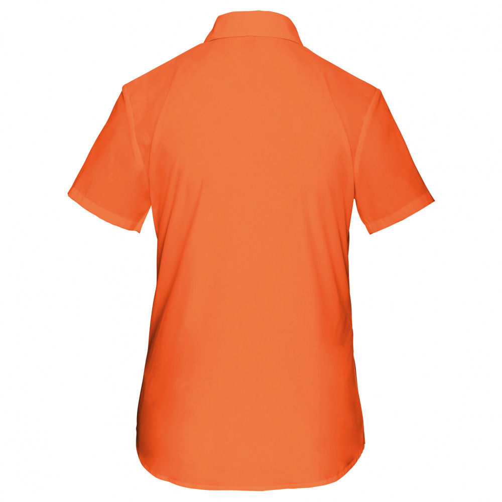 Kiváló minőségű termékünk ez az enyhén karcsúsított szabású, narancs rövid ujjú női blúz bal oldalon mellzsebbel.