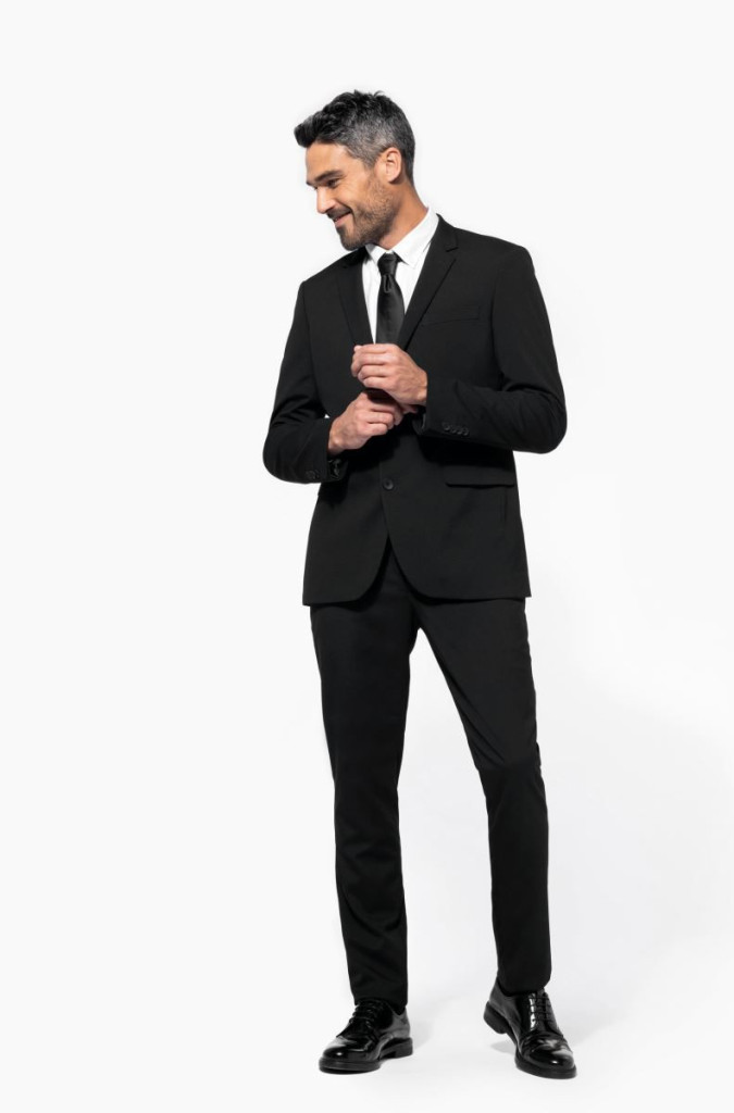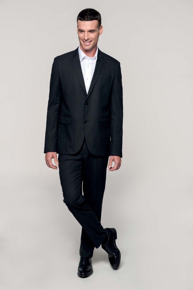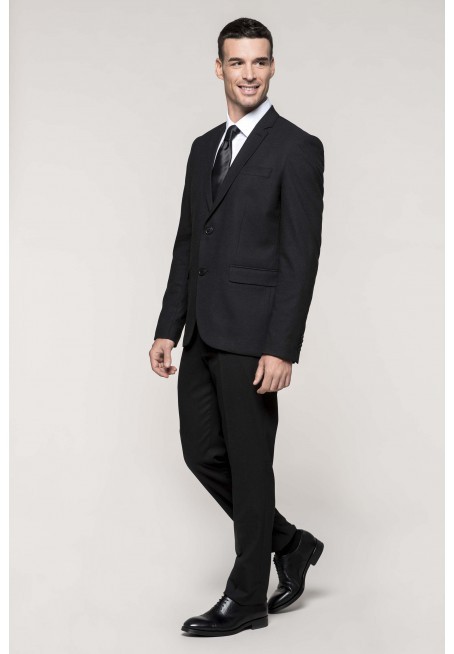 A fekete zakó anyaga 64% poliészterből, 34% viszkózból és 2% elasztánból készült, 220 g/m2 súlyú. A bélés 100% poliészterből (tafetta) készült.