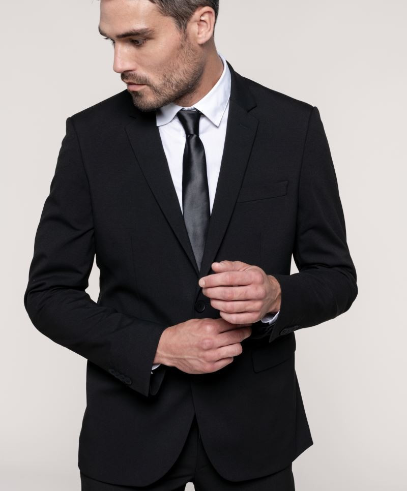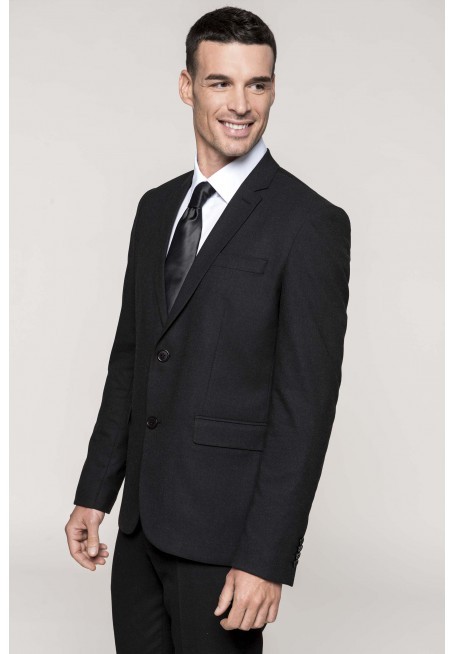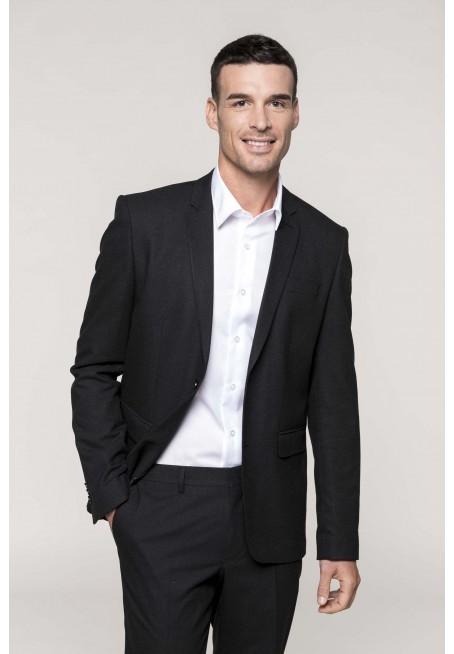A 2 gombbal záródó fekete zakó 4 gombos mandzsetával készült.