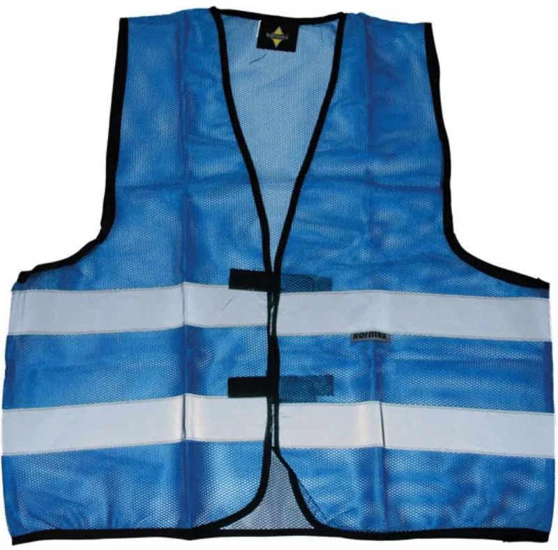 A kék jól láthatósági mellényen elhelyezett fényvisszaverő csíkok sötétben jól láthatóvá teszik a viselőjét!