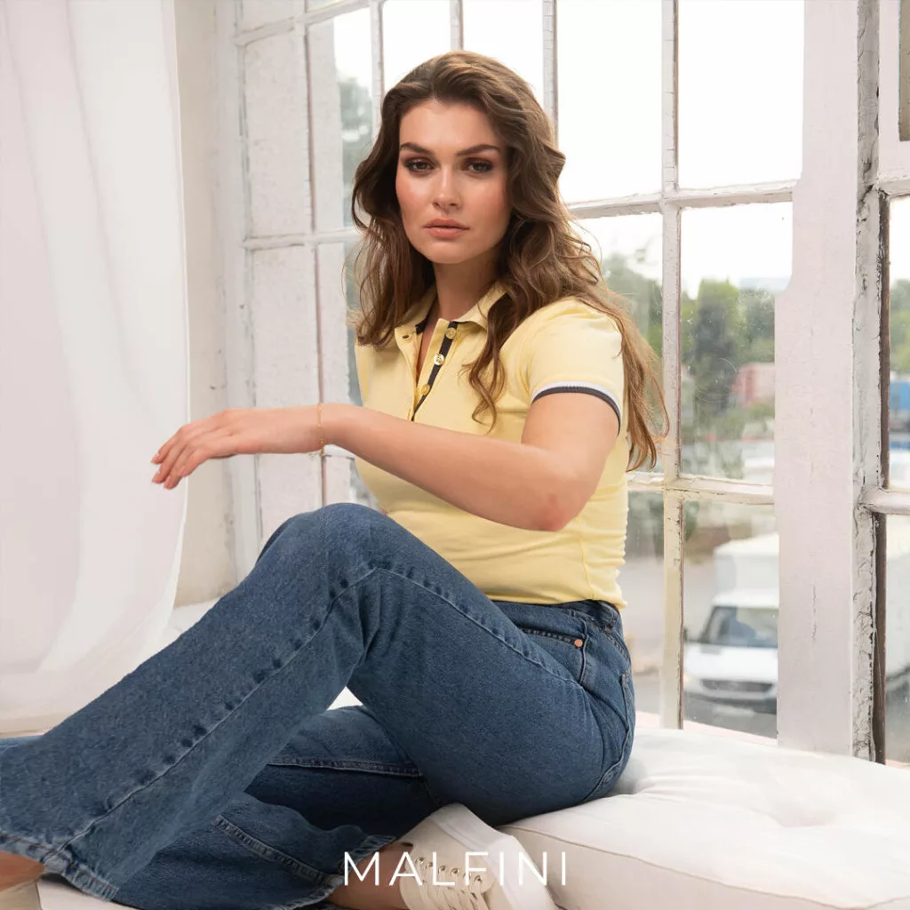 Karcsúsított, szűkített szabású Malfini 257 Collar Up női galléros póló, oldalvarrással, színazonos 4 gombos keskeny gombolópánttal, a felhajtható gallér alsó felülete és az ujjak szegélye kontraszt színű csíkokkal, bordás kötésű gallérral és ujjvégekkel, pamut piké szövetből!
