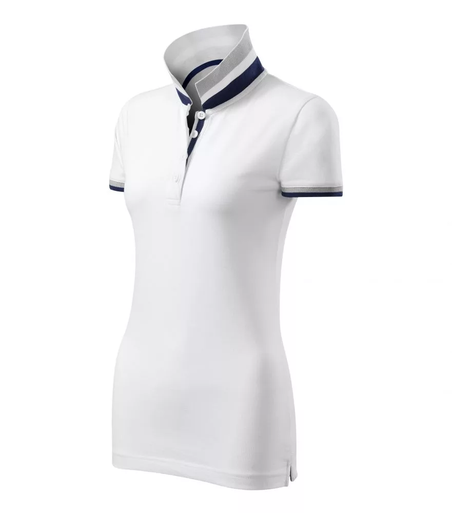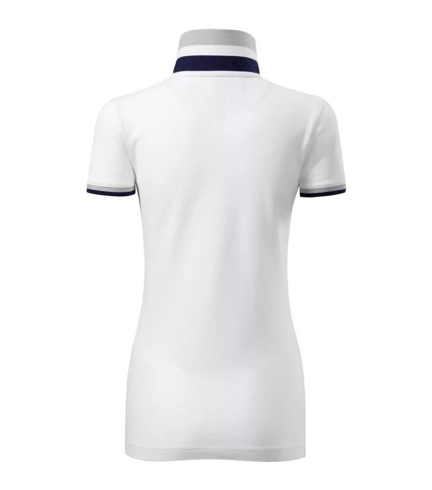 Karcsúsított szabású, kiváló minőségű galléros női póló piké anyagból, az ujjvégeken és a a galléron eltérő színű dupla kontraszt színekkel díszítve