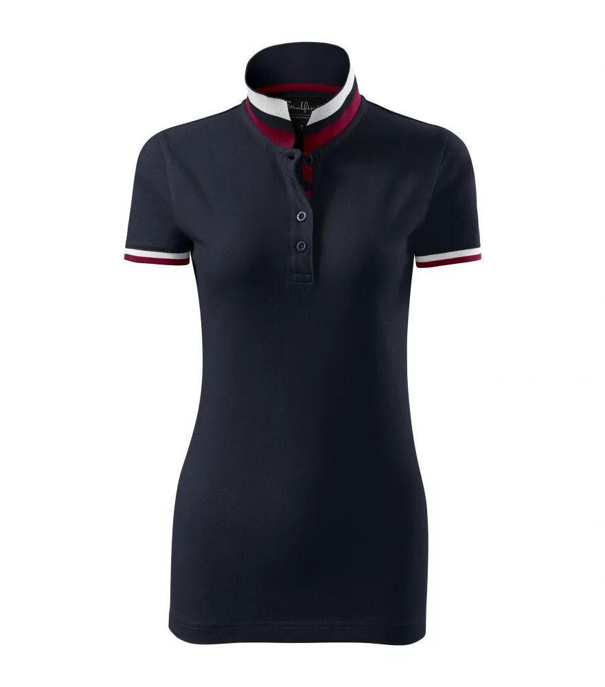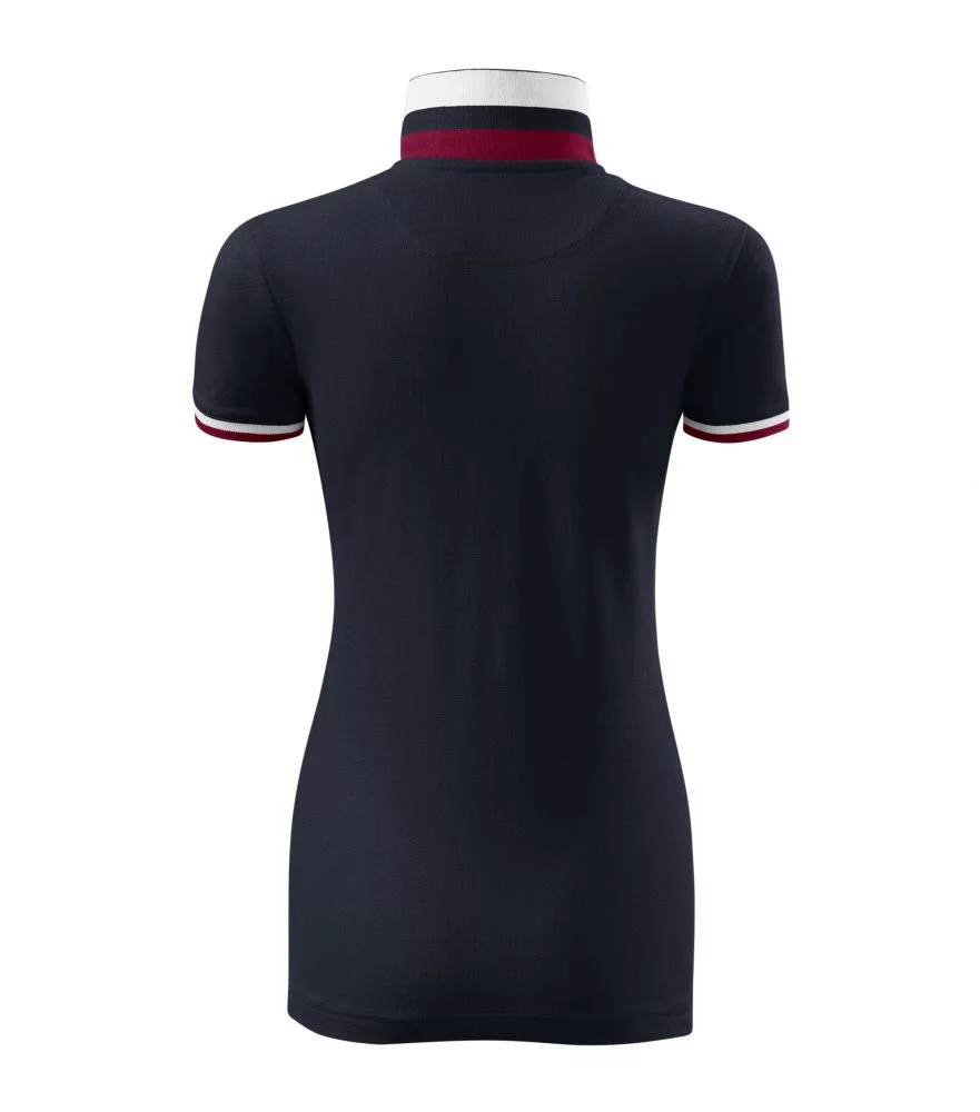 Karcsúsított szabású, kiváló minőségű galléros női póló piké anyagból, az ujjvégeken és a a galléron eltérő színű dupla kontraszt színekkel díszítve