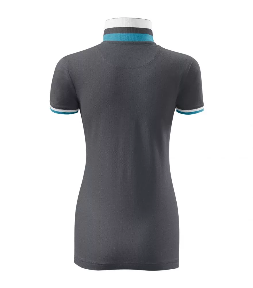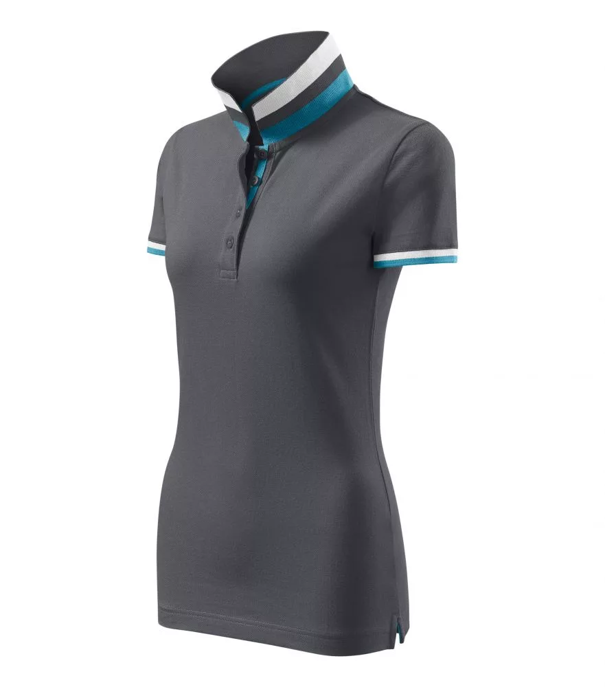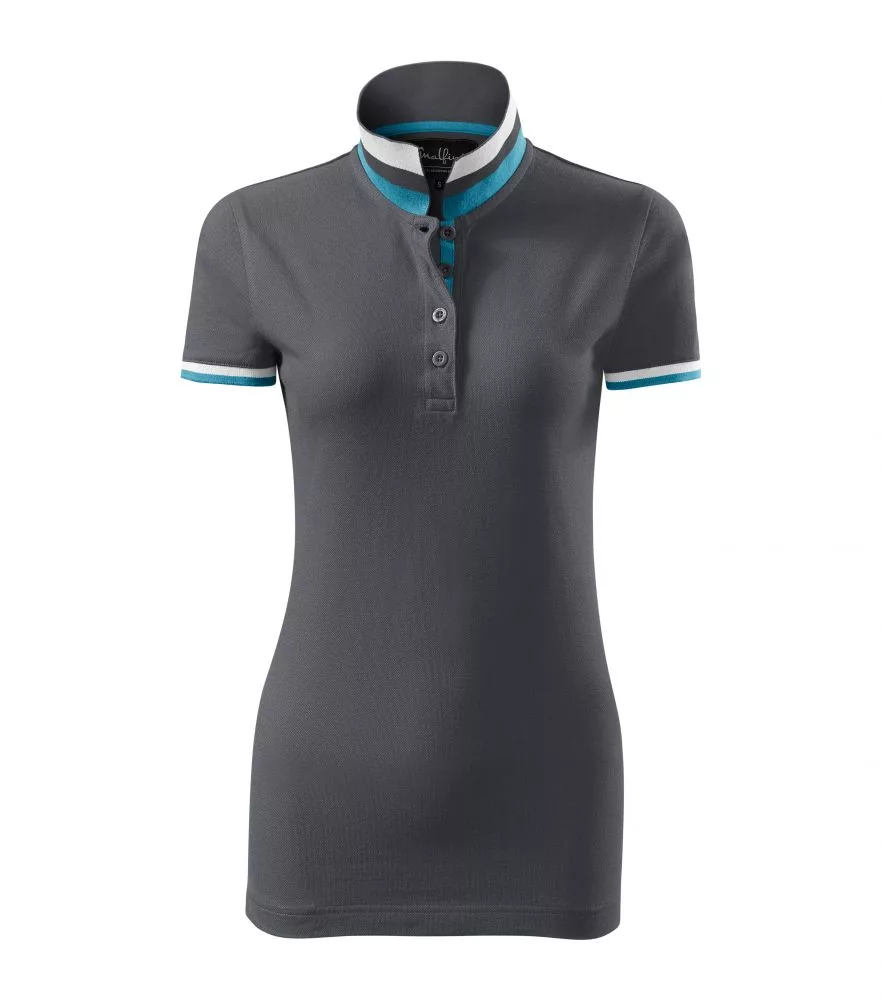 Karcsúsított szabású, kiváló minőségű galléros női póló piké anyagból, az ujjvégeken és a a galléron eltérő színű dupla kontraszt színekkel díszítve