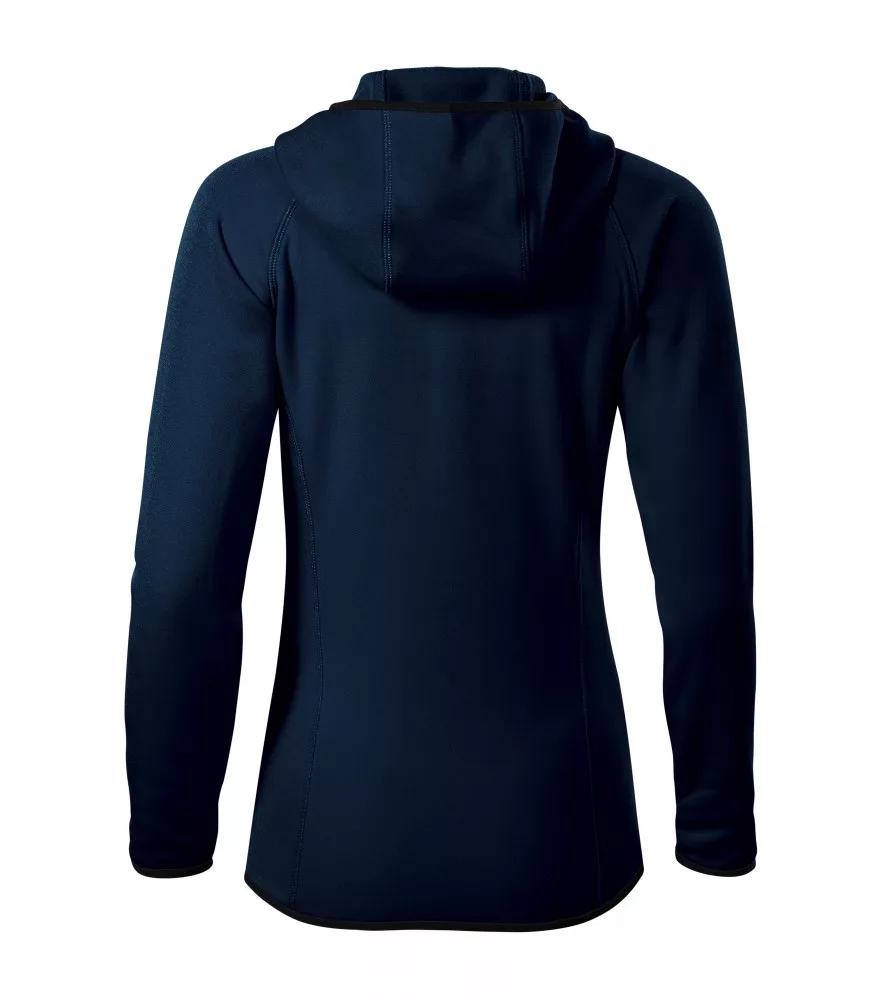 A cipzáros női polár pulóver kapucni állvédővel, nyakrésze belső szegéllyel, raglan ujjakkal, cipzáros zsebekkel, elasztikus szegéllyel és ívelt, hátul kissé hosszított alljal készült.