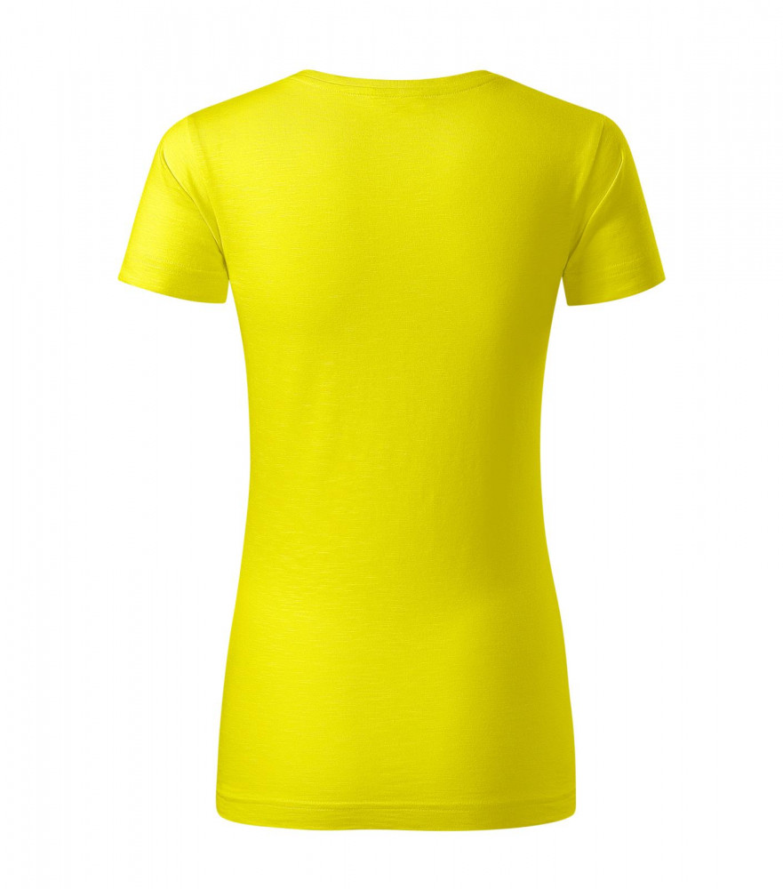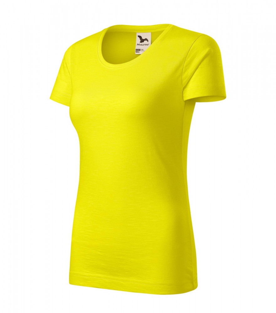 Karcsúsított szabású, kiváló minőségű sárga női rövid ujjú póló single jersey slub anyagból, mely 100% Organikus pamutból készült