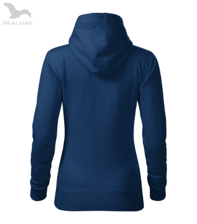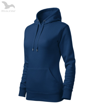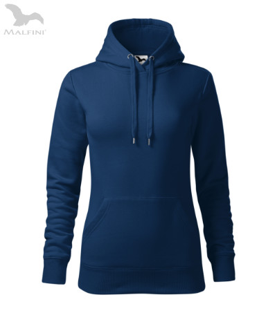 - A kék női kapucnis pulóver anyaga 65% pamutból és 35% poliészterből készült, 320 gramm/m2 súlyú. A pulóver belső része bolyhos (Futter), külső felülete nyomásra és hímzésre is alkalmas.