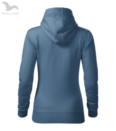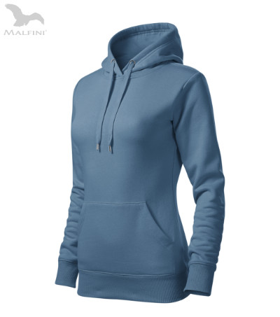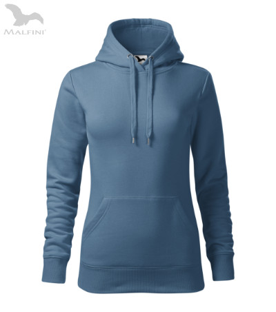 - A kék női kapucnis pulóver anyaga 65% pamutból és 35% poliészterből készült, 320 gramm/m2 súlyú. A pulóver belső része bolyhos (Futter), külső felülete nyomásra és hímzésre is alkalmas.