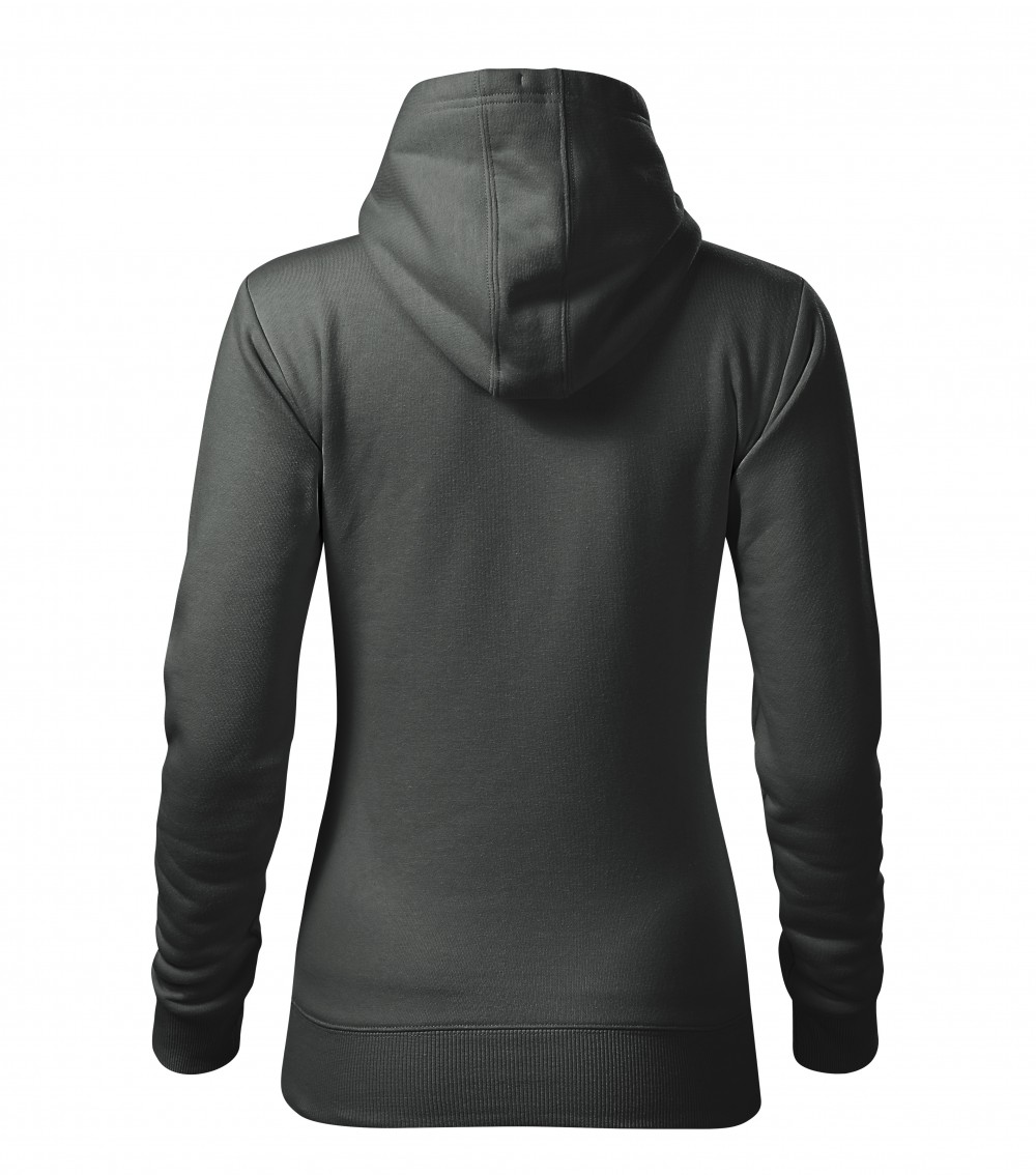 A szürke kapucnis női pulóver anyaga 65% pamutból és 35% poliészterből készült, 320 g/m2 súlyú. A pulóver belső része bolyhos, külső felülete nyomásra és hímzésre is alkalmas.